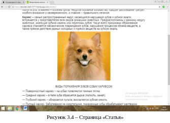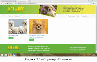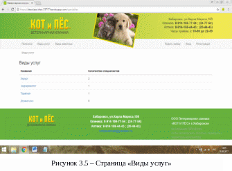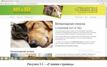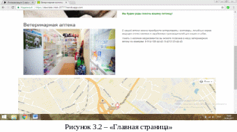 На этой странице размещается основная информация по ветеринарной клинике. На данной странице можно выделить разделы: приветственное слово, информация об аптеке в этой клинике и расположение на карте (рисунок 3.2).