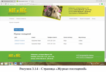 Также отдельный функционал выделен для пользователей с ролью Доктор. Авторизовавшись на сайте, доктор попадает на страницу «Журнал посещений» (рисунок 3.14). На данной странице размещено расписание приема пациентов этого доктора.