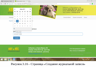Внеся все данные, необходимо нажать кнопку «Сохранить». После сохранения данных пользователь попадает на страницу Журнальная запись, в которой отображается вся сохраненная информация, а также дается возможность отредактировать запись (рисунок 3.17). Для редактирования необходимо нажать на поле с датой - откроется календарь. В нем выбрать день месяца, в который будет прием, а затем нажать на панель с часами для выбора времени посещения врача.