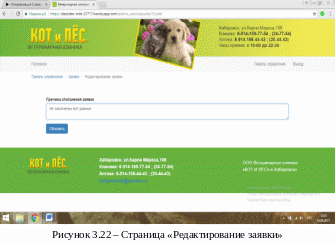 На данной странице у Администратора отображается список всех заявок, поданных пользователями. Для большего удобства отклоненные заявки выделены красным цветом, принятые – зеленым цветом, на рассмотрении – не выделены. У Администратора есть право отклонить заявку, для этого ему нужно нажать на пункт Отклонить заявку, расположенный в правой стороне таблицы. Выбрав данное действие, Администратор попадает на форму, в которой ему необходимо заполнить причину отклонения заявки (рисунок 3.22).