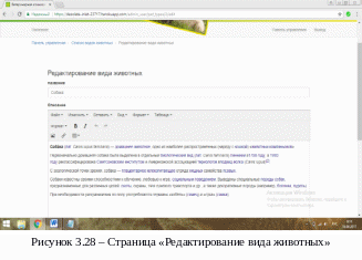 На данной странице Администратор может добавить, удалить или отредактировать информацию по справочнику «Виды животных». Для создания новой категории необходимо нажать кнопку «Создать», для редактирования или удаления – нажать на название вида, что позволит перейти на страницу изменения существующей записи (рисунок 3.28).