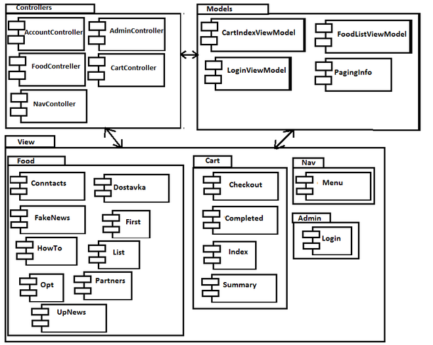 На данной диаграмме все компоненты поделены на три зависимых части, согласно шаблону проектирования: модели, контроллеры, и представления. Часть модели хранит в себе классы, которые описывают модель базы данных.