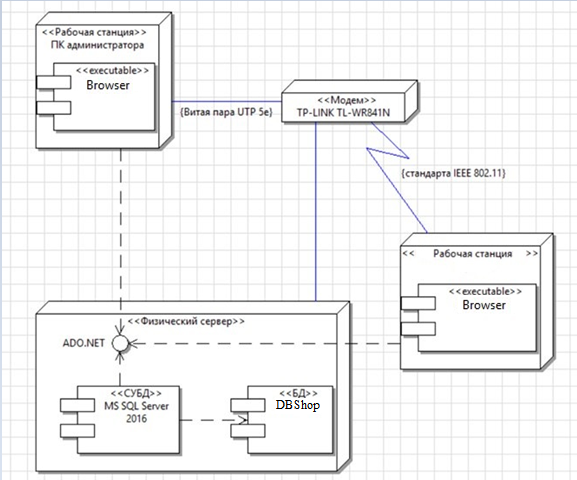 На рисунке 2.18 представлена диаграмма развертывания для проектируемой информационной системы.Взаимодействие между клиентской и серверной частью, как показано на рисунке, осуществляется через интерфейс ADO.NET (ActiveXDataObject для .NET) – технологии, предоставляющей доступ к данным для приложений, основанных на Microsoft .NET.