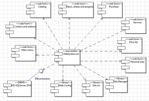 На заключительной стадии проектирования информационной системы Интернет-магазина строительных материалов устанавливается распределение функций по компонентам и строится их распределение по узлам системы.Для этого предназначены диаграммы компонентов и реализации.