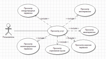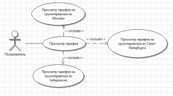 Далее идут две диаграммы декомпозиции «Просмотр тарифов» (рисунок 3.4) и «Просмотр услуг» (рисунок 3.5). Здесь участвует все также один актер «Пользователь». Просмотреть тарифы или услуги он сможет, выбрав соответствующую вкладку на сайте. Ему будет предоставлена информация по тарифам перевозок из Москвы, Санкт-Петербурга и Владивостока.