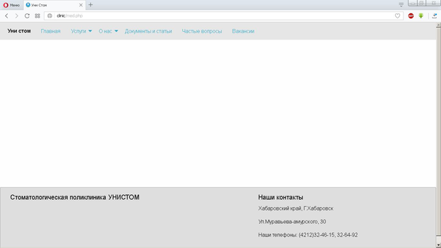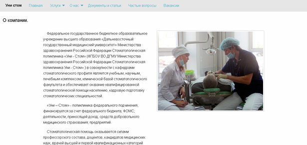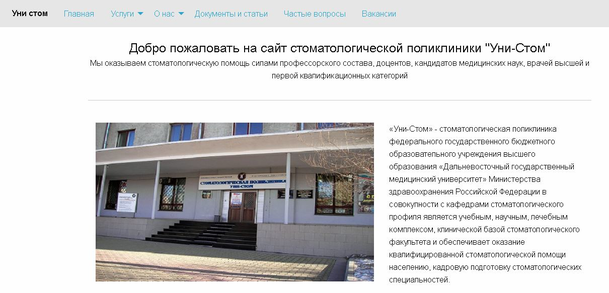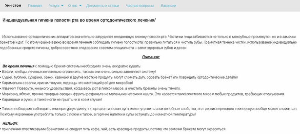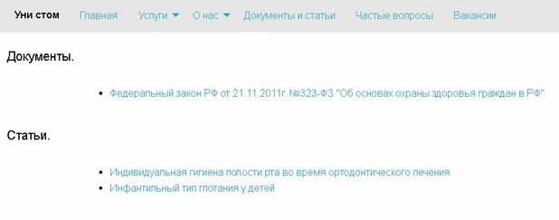 Страница “Документы и статьи” содержит информацию об юридических документах, относящихся к поликлинике “Уни стом” и статьи санитарно-просветительного содержания для ее клиентов (рисунок 7.13).
