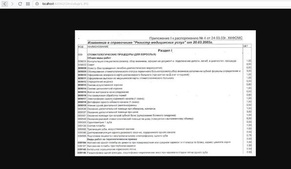 Выбрав пункт “Услуги” и нажав “Список услуг” (рисунок 7.2), пользователь может ознакомиться со всем списком медицинских услуг, предоставляемых стоматологической поликлиникой. Нажав на кнопку “Регистр медицинских услуг”, пользователь увидет новое окно с небольшими изображениями реального регистра услуг. Открыв меньшую копию любого листа, можно увидеть ее обычный вид (рисунок 7.3).