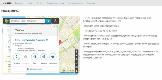 На странице “Контакты”, размещена информация о расположении поликлиники “Уни стом” на карте города Хабаровска, которая представлена на сайте приложения “2Gis”, и ее основные контактные данные (рисунок 7.12).