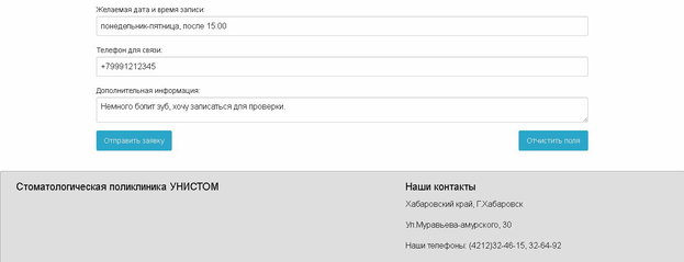 На ней расположены поля для запонения пользователем, планирующим запись на прием к врачу. Как только пользователь заполнит все поля и нажмет на кнопку “Отправить заявку”, он получит ответ о том, что заявка отправлена на рассмотрение и ему перезвонят в ближайшее время (рисунок 7.5).