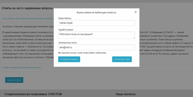 Существует возможность задать собственный вопрос на этой же странице, заполнив форму, представленную на рисунке 7.16. По мере поступления вопроса на почту клиники, публикуется ответ от соответствующего специалиста.