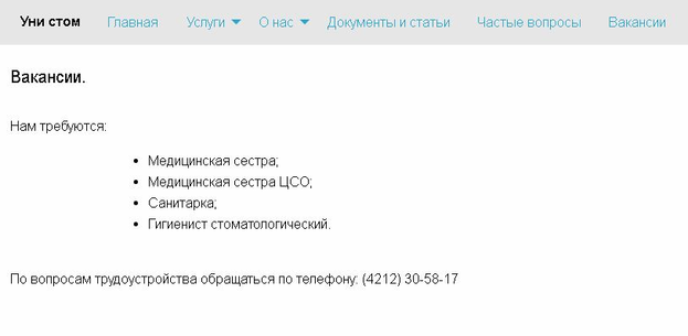 Страница “Вакансии” содержит сведения о свободных вакансиях (рисунок 7.18).