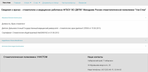Перейдя во вкладку “Медицинский персонал”, пользователь ознакомится со сведениями о врачах-стоматологах и медицинских работниках поликлиники.