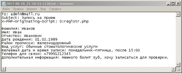 Полностью заполненная заявка отправляется на почту поликлиники. Ознакомившись с данными, регистратор перезванивает пользователю о подтверждении его записи. На рисунке 7.7 приведен пример письма, которое отправится на почту поликлиники. Данные приведены в логе локального сервера.