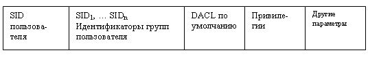 Так же, как и объекты, субъекты должны иметь отличительные признаки - контекст пользователя, для того, чтобы система могла контролировать их действия. Сведения о контексте пользователя хранятся в маркере доступа. При интерактивном входе в систему пользователь обычно вводит свое имя и пароль. Система (процедура Winlogon) по имени находит соответствующую учетную запись, извлекает из нее необходимую информацию о пользователе, формирует список привилегий, ассоциированных с пользователем и его группами, и все это объединяет в структуру данных, которая называется маркером доступа. Маркер также хранит некоторые параметры сессии, например, время окончания действия маркера. Таким образом, именно маркер является той визитной карточкой, которую субъект должен предъявить, чтобы осуществить доступ к какому-либо объекту. Основные компоненты маркера доступа показаны на рисунке 2.2.