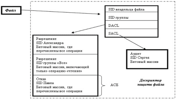 Дескриптор безопасности представлен на рисунке 2.1, он содержит SID владельца объекта, SID групп для данного объекта и два указателя на списки DACL (Discretionary ACL) и SACL (System ACL) контроля доступа. DACL и SACL содержат разрешающие и запрещающие доступ списки пользователей и групп, а также списки пользователей, чьи попытки доступа к данному объекту подлежат аудиту.