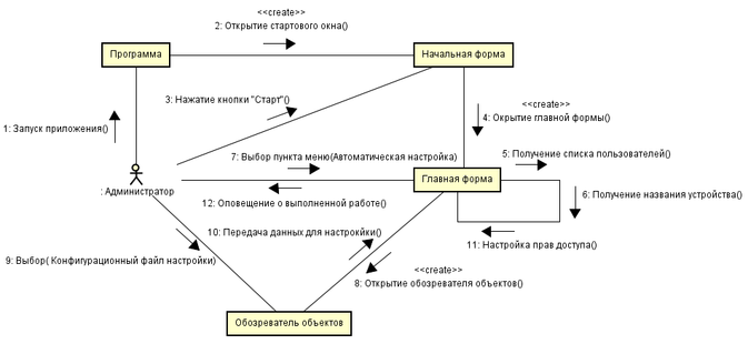 На рисунке 3.9 показана диаграмма коммуникаций при автоматическом режиме настройки прав доступа. Действующий актор - это администратор. Цепочка взаимодействия выглядит следующим образом: