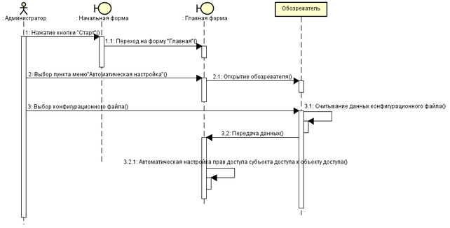 Последовательность происходящая при автоматической настройки прав субъекта доступа к объекту доступа изображенна на рисунке 3.6 Взаимодейтсвие происходит следующим образом, администратор осуществляет вход на главную форму, выбирает пункт меню “автоматическая настройка”, после чего открываеться обозреватель объектов, в нём администратор должен выбрать конфигурационный файл. После его нахождения, программа считает данные на нём и передаёт их в метод находящийся на главной форме, затем отработает алгаритм производящий автоматизированую настройку прав доступа и в конце администратор получит уведомление об окончании найтройки прав доступа.