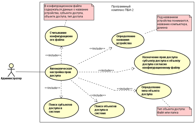 Анализируя ранее выдвинутый функционал программного продукта, можно сделать вывод то что элемент внешнего окружения будет всего один это администратор. На рисунке 3.1 представлена контекстная диаграмма вариантов использования которая описывает общий функционал разрабатываемого программного продукта. Администратор, используя программу может производить следующие действие: автоматическую настройку прав доступа субъекта доступа к объекту доступа, ручную настройку прав доступа, просмотреть какие права доступа назначены для субъектов доступа, а также пользователь может вывести отчёт об выполненной настройке доступа.