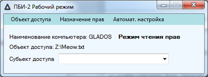 Как видно на рисунке 5.7 после выбора объекта доступа, программа переходит в режим чтения прав, это означает что при выборе пользователем субъекта доступа – пользователя компьютера, программа выведет те права доступа что имеет данный субъект доступа к объекту доступа. Так же после выбора объекта доступа, заполняется надпись об объекте доступа и появляется элемент управления, позволяющий производить выбор субъектов доступа. Так же появляется новый пункт главного меню “Назначение прав”. Для того что бы продолжить процедуру ручной настройки прав доступа пользователь в управляющем элементе выбора субъектов доступа выбирает нужный ему субъект доступа. На рисунке 5.8 показан вид главного окна после выбора субъекта доступа.