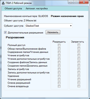 Как видно из рисунка 5.10 программа переходит в режим назначение прав и в главном окне программы появляются новые элементы управления, а именно элемент выбора вида назначаемых прав, а также кнопка “Назначить”. Что бы субъекту доступа назначить специальные разрешения нужно поставить галочку в элементе управления “Дополнительные разрешения”, если же требуется назначить стандартные права доступа, требуется в ранее сказанном элементе управления снять галочку.