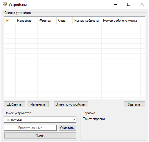 Форма «Устройства» предназначена для отображения списка устройств, находящихся в системе, а так же для добавления, изменения, удаления данных устройств и вывода отчетов по данным выбранного устройства. Графический интерфейс данной формы представлен на рисунке 4.6.