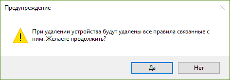 Чтобы удалить данные устройства необходимо выбрать данное устройство в списке и нажать клавишу «Удалить». После этого на экран выведется предупреждение об удалении, изображенное на рисунке 4.10 и при подтверждении удаления происходит удаление объекта и связанных с ним данных.