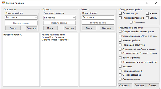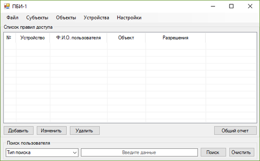 Помимо главного меню, эта форма содержит список правил разграничения доступа, и кнопки для работы с ним. Работа с данным списком подразумевает создание новых правил, изменение существующих, удаление и поиск правил.