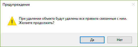 Чтобы удалить данные объекта, необходимо выбрать его в списке и нажать клавишу «Удалить». После этого на экран выведется предупреждение об удалении, изображенное на рисунке 4.22 и при подтверждении удаления происходит удаление объекта и связанных с ним данных.