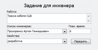 Название работы появляется в поле «Работа» в задании для инженера. Далее начальник группы выбирает свойство работы, инженера, которому необходимо выдать задание и вводит планируемое время на выполнение. После нажатия кнопки «Передать» задание переходит к инженеру. Перечень всех работ по проектам находится в таблице RABOTA. Средства для выдачи задания представлены на рисунке 2.10.