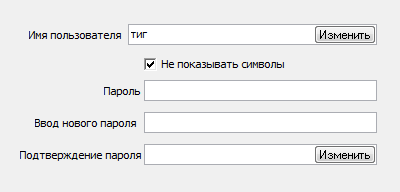Вкладка «Учетная запись» предназначена для изменения данных для авторизации пользователя. На вкладке предоставлена возможность изменить имя пользователя, а также пароль. Пароль изменяется только в случае верного ввода старого пароля, в противном случае попытка замены будет отклонена. Элементы, размещенные на вкладке, показаны на рисунке 2.4.
