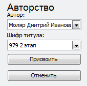 Вкладка «Авторство» в АРМ начальника отдела отличается от одноименной вкладки АРМ начальника группы возможностью назначать авторов титулов (рисунок 2.13). На панели справа от списка авторов начальником отдела выбирается титул и сотрудник, которому будет присвоено авторство данного титула.