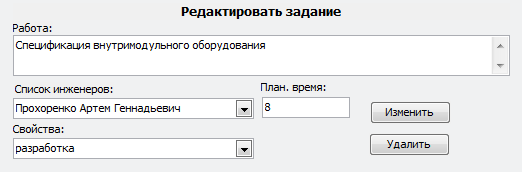 Во вкладке «Выданные задания» начальник отдела может просмотреть задания, выданные всеми руководителями отдела. Он имеет возможность редактировать и удалять любое из них. Форма для редактирования заданий показана на рисунке 2.15.