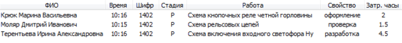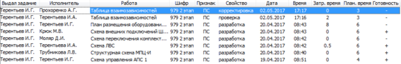 Для этого во вкладке размещена таблица, содержащая список выданных заданий с необходимой для инженера информацией, а именно, название работы (например, «Схема стоек питания»), шифр титула, к которому относится данная работа, свойство работы (разработка, корректировка, оформление и т. д), время, планируемое для выполнения полученного задания, а также время, которое уже было затрачено на его выполнение.