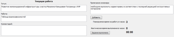 Необходимые сведения размещены под заголовком «Текущая работа». Инженер видит на экране название титула, по которому выполняется работа, название самой работы, комментарии руководителя, выдавшего задание (например, о том, какими альбомами необходимо воспользоваться при выполнении), время, планируемое для выполнения, суммарное время, затраченное на работу, а также время, которое было затрачено с момента перехода к заданию.