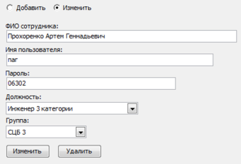 При добавлении сотрудника начальником отдела вводятся ФИО сотрудника, имя пользователя и пароль, необходимые для авторизации, выбираются должность и группа.