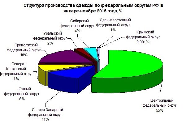 По данным Госкомстата России в январе-ноябре 2015 года в России отгружено изделий текстильного производства на сумму около 131,6 млрд. рублей, что на 27 % больше по сравнению с аналогичным периодом 2014 года. В структуре российского производства одежды в денежном выражении за период январь – ноябрь 2015 года 55 % приходится на Центральный федеральный округ, 11 % - на Северо-западный федеральный округ и 18 % производится в Приволжском федеральном округе.