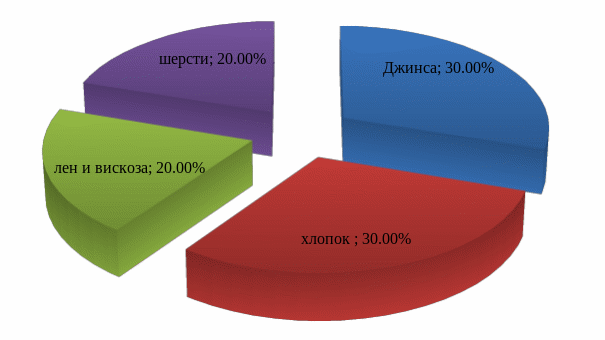 30 % опрошенных предпочтение в материалах и тканях для женской одежды отдают джинсу, 30 % - хлопку, 20 % - лен и вискоза, 20 % - шерсти.
