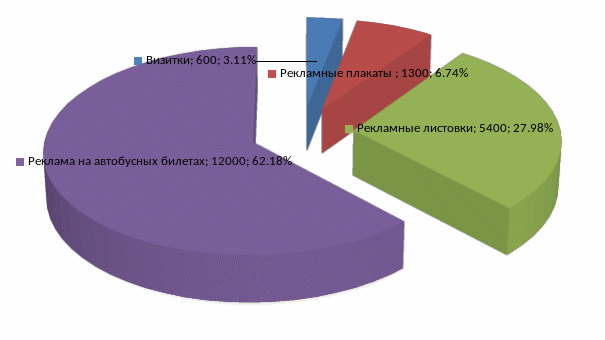 Из структуры затрат по видам рекламных средств видно что большую часть занимают затраты на рекламу на автобусных билетах. Реклама на билетах является наиболее быстрым способом привлечения клиентов в силу ряда факторов:
