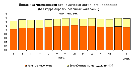 Численность экономически активного населения в возрасте 15-72 лет (занятые + безработные) в феврале 2015г. составила 75,8 млн.человек, или 52% от общей численности населения страны (рисунок 2).