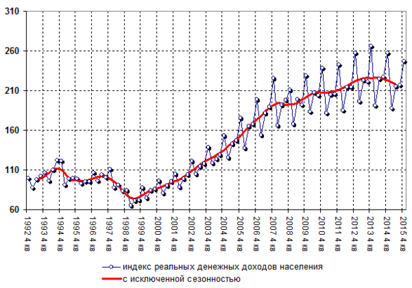 По оценкам Федеральной службы государственной статистики индекс реальных располагаемых денежных доходов населения составил 113,8% за 4 квартал 2015 года в сравнении с предыдущим периодом или 95,8% в годовом выражении представлен на рисунке 1 .