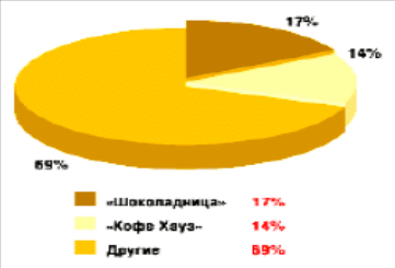Лидерами кофейня являются: «Шоколадница» кофейня и «Кофе Хауз», кофейня доли которых составляют кофейня соответственно 17 кофейня и кофейня 14% российского кофейня рынка в кофейня стоимостном выражении кофейня (рис. 11). На кофейня каждую из кофейня оставшихся кофеен кофейня приходится менее кофейня 1% рынка. В кофейня настоящее время кофейня в России действует кофейня 230 кофеен кофейня «Шоколадница». Основная кофейня часть кофеен кофейня этой сети кофейня сосредоточена в кофейня Москве и Московской области кофейня – 150 заведений, кофейня расположенных в кофейня исторических частях кофейня города, крупных кофейня столичных и кофейня подмосковных торговых кофейня центрах, аэропортах кофейня и бизнес-центрах.