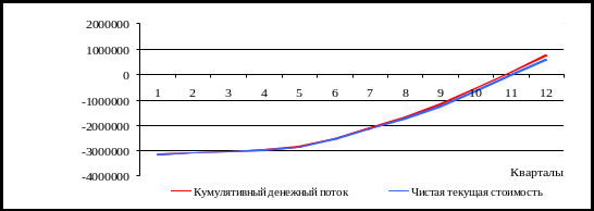 По чистой текущей стоимости проект окупится в 4 квартале 3-го года, а по кумулятивному денежному потоку в 3 квартале 3-го года.