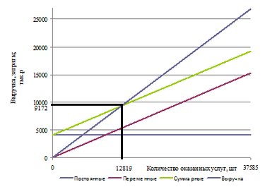 Точка безубыточности составит 9172000 р.(выручка) и 12819 шт (количество оказанных услуг).