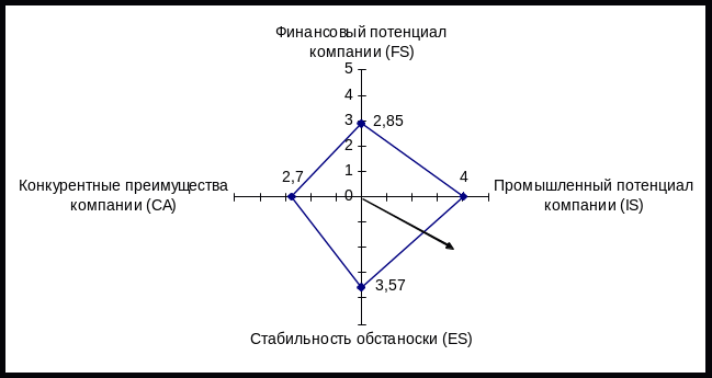 По результатам построения матрицы SPACE видно, что организация имеет тенденцию к конкурентному стратегическому состоянию. Это состояние характерно для привлекательной отрасли. Организация получает конкурентные преимущества в относительно нестабильной обстановке. Критическим фактором является финансовый потенциал. Необходимо парировать угрозы, связанные с потерей финансирования.