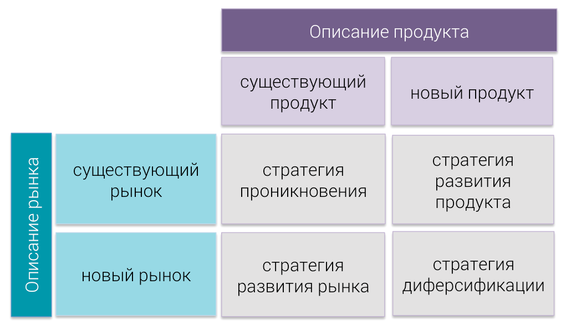 Матрица Ансоффа «продукт (услуга) – рынок» (см. рисунок .2), представляющий собой инструмент для классификации продукции и рынков в зависимости от степени неопределенности перспектив продажи продукции или возможностей проникновения данной продукции на данный рынок.