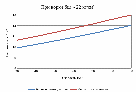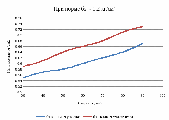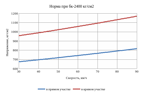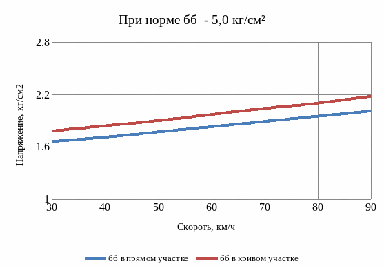 Из графика видно, что скорость и напряжение на смятие в прокладке под подкладкой при железобетонной шпале линейно зависимы, вследствие чего при увеличении скорости увеличивается напряжение. При скорости 90 км/ч напряжение растяжения в прямом участке пути составляет 12,99 кг/см
