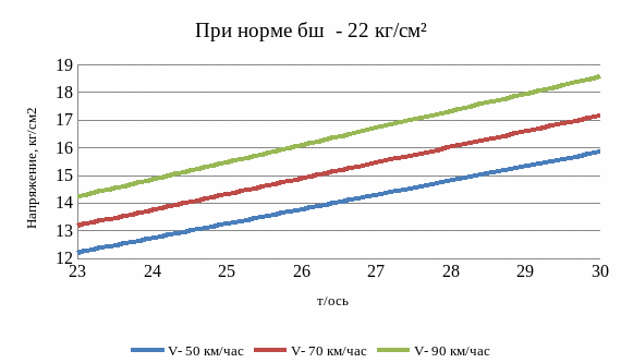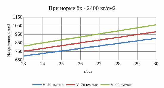 Из графика видно, что при рассматриваемых скоростях 50 км/час, 70 км/час, 90 км/час и осевых нагрузках от 23 до 30 т/ось, применяемый тип рельсов Р-65 соответствует условиям эксплуатации и не превышает допускаемого значения в 2400 кг/см