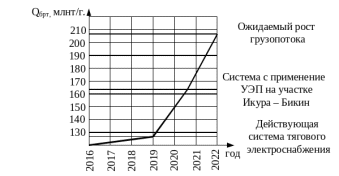 В результате, при ежегодном росте грузопотока поэтапное усиление участка Икура – Бикин в конечном итоге приведет к переходу на систему тягового электроснабжения с ЭУП. Эта система в комплексном применении с другими мероприятиями по усилению инфраструктуры ДВЖД способна обеспечить планируемый уровень грузооборота.