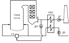 ДРГ-дымосос рециркуляции газов; ДВ-дутьевой вентилятор; ДС-дымосос; РВП- регенеративный воздухоподогреватель; СК- смесительная камера.