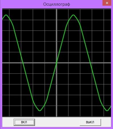 Для того, чтобы наблюдать за выходящим током, а именно, за синусоидой переменного тока, в программе предусмотрен осциллограф. Для открытия окна необходимо нажать на клавишу в рабочем окне «Осциллограф». На рисунке 1.11 изображено это окно.